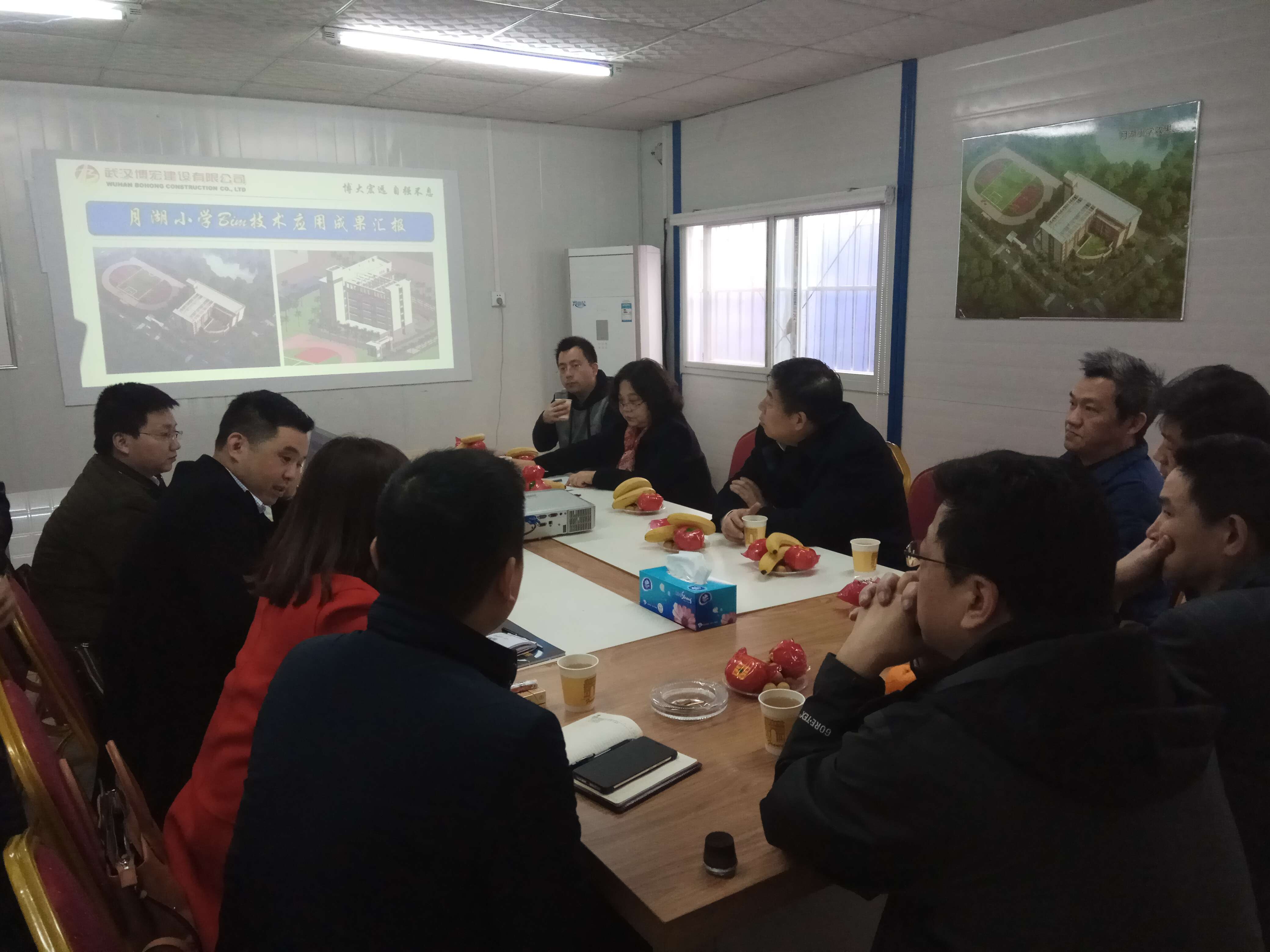 考察交流會議上為加強雙方了解,公司經營副總蘇琦首先就公司近年來發展及資質情況進行了簡單介紹。接下來公司副總工程師梅浩對BIM技術在月湖小學施工建設中取得的效果進行了概述。總工辦文志勇從圖紙審查、碰撞檢查、可視化交底、砌體排磚、進度質量安全管理、施工模擬等多個方面一一介紹BIM技術為月湖小學工程建設帶來的成果及效益,總結了BIM技術應用經驗,并簡單介紹了下一步BIM應用計劃安排。