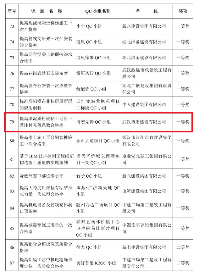 每年,公司都根據(jù)各大在建項目的實際情況,針對生產(chǎn)中的難題,從挖潛增效、強(qiáng)化管理等角度確定課題,成立相關(guān)技術(shù)攻關(guān)小組,構(gòu)思切實可行的質(zhì)量提升措施,并邀請技術(shù)專家對其進(jìn)行指導(dǎo)完善。本次獲得一等獎的《提高淤泥質(zhì)粉質(zhì)粘土地質(zhì)下灌注樁充盈系數(shù)合格率》,在其攻關(guān)過程中,“博宏先鋒 QC 小組”制定了嚴(yán)格的工作計劃和科學(xué)的攻關(guān)流程,按月推進(jìn),最終形成了一套可復(fù)制、可推廣的工作經(jīng)驗,攻關(guān)小組也通過QC活動掌握了一套提升項目管理質(zhì)量的方法論。