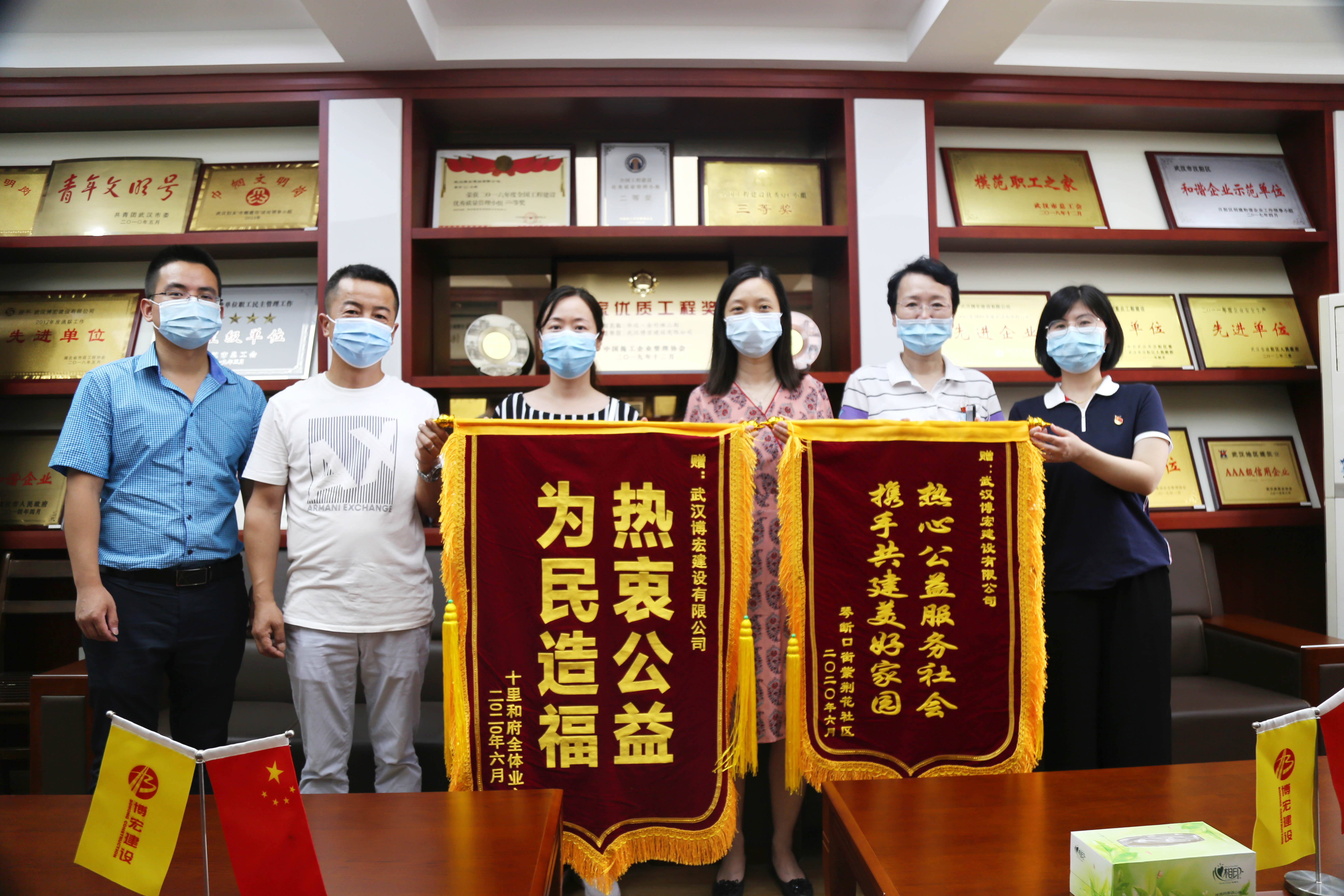 ?? 6月9日上午,漢陽區(qū)委宣傳部代表和漢陽區(qū)紫荊花社區(qū)、十里和府小區(qū)物業(yè)代表結(jié)伴而來,為博宏建設(shè)送來兩面錦旗,感謝博宏建設(shè)在改善社區(qū)工作環(huán)境,服務(wù)社區(qū)公益事業(yè)中做出的努力。據(jù)悉,十里和府小區(qū)一號(hào)樓一樓裝修老舊,地面不平,居民出行不便,博宏建設(shè)裝飾裝修項(xiàng)目部在周邊施工時(shí),接到相關(guān)指示,先后派出6人歷時(shí)6天,一并對(duì)該區(qū)域近300平米進(jìn)行了地磚更換,裝修效果得到了居民和社區(qū)的高度認(rèn)可。