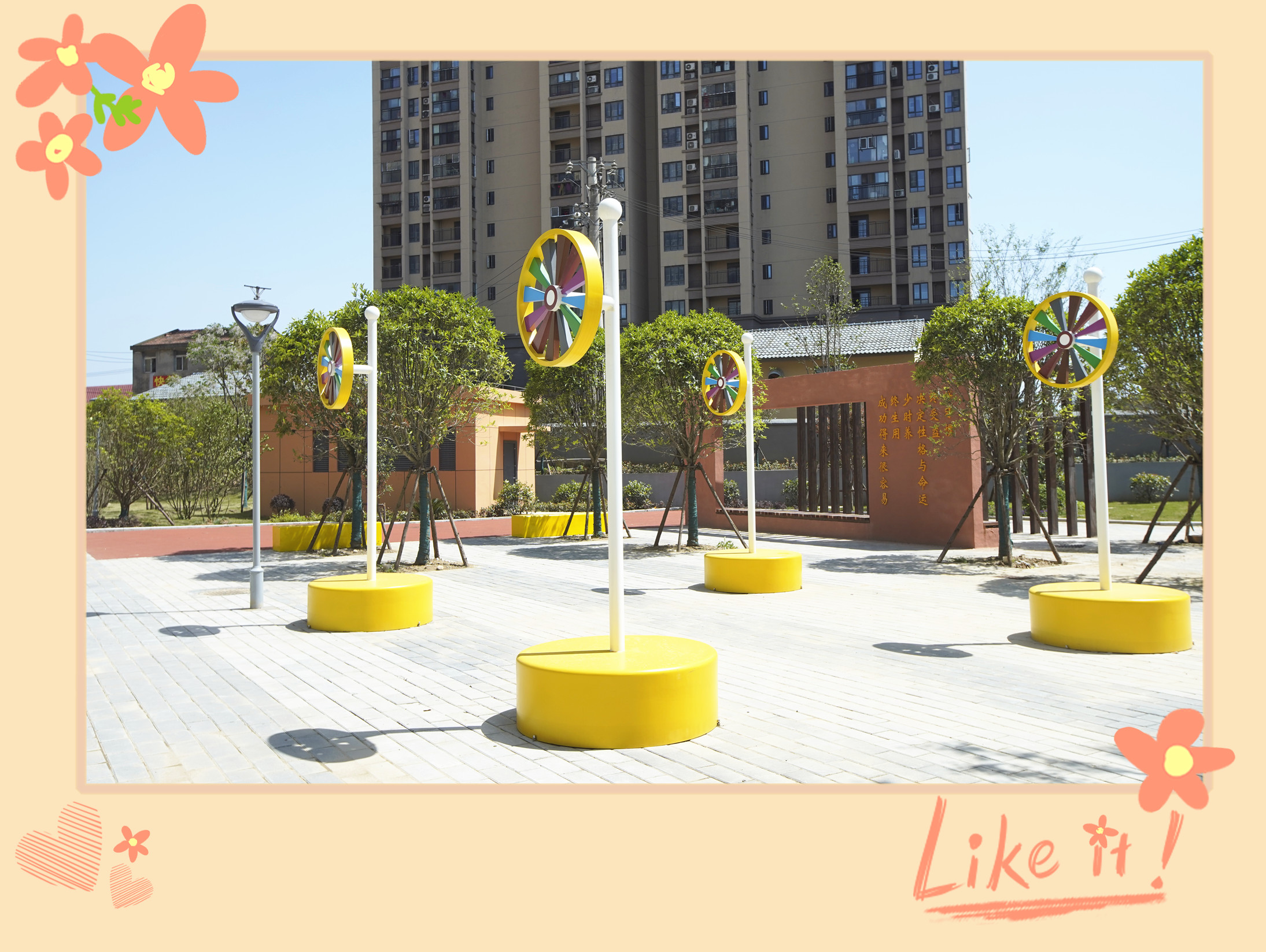 “大風車呀吱呀吱悠悠地轉,這里的風景呀真好看,天好看,地好看,還有一群快樂的小伙伴!”下課鈴聲響起,我在這里等你!