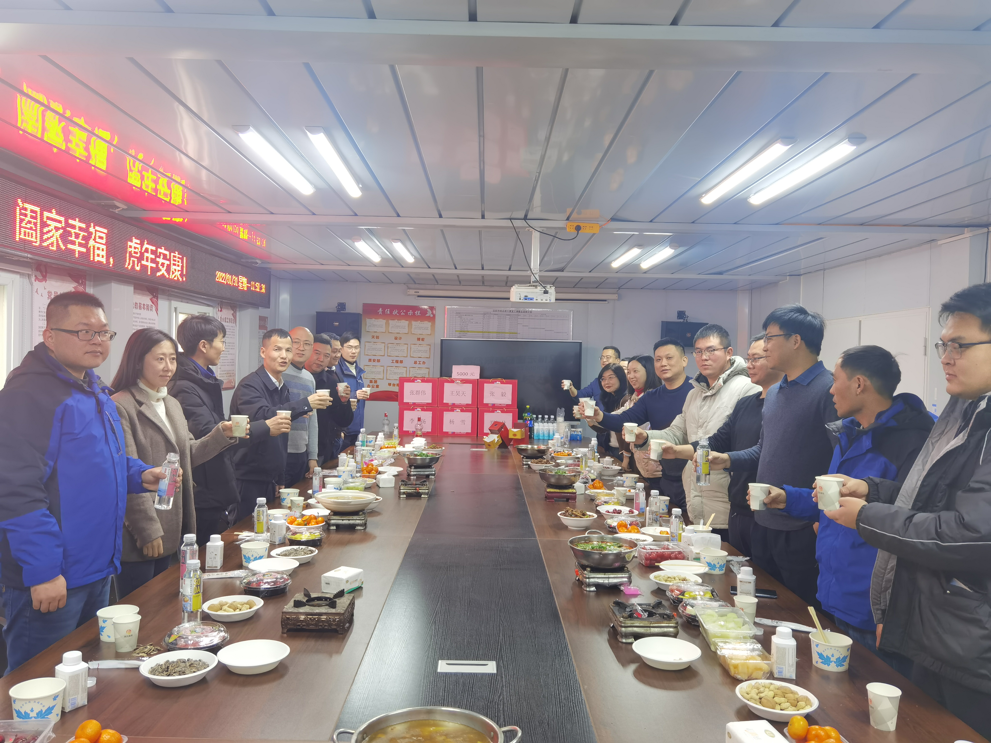 1月31日中午,在除夕這個特別的日子,在漢陽市政建設大廈項目部,公司就地過年以及在工地值守的職工圍坐在桌邊,吃了一頓熱乎乎的團圓飯,陪他們一起吃團圓飯的,還有公司黨支部書記、董事長鄒勇,總經理蘇琦,黨支部副書記、工會主席郭一清,副總經理奚雷、辛桂華以及總經理助理周昌文、王哲、李磊等領導一行。飯桌前,大家如同一家人一起聊聊家常、看看電視,共度美好的除夕佳節。