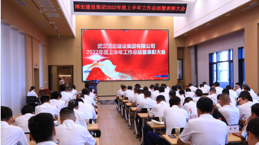 總結催人奮進,表彰凝聚力量。7月9日上午8:30,博宏建設集團2022年上半年工作總結暨表彰大會在公司31樓大會議室如期舉行,公司支部班子、部門及項目部負責人、技術負責人、生產經理、商務經理及業務骨干代表等,共計78人參加會議。