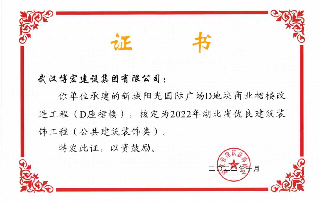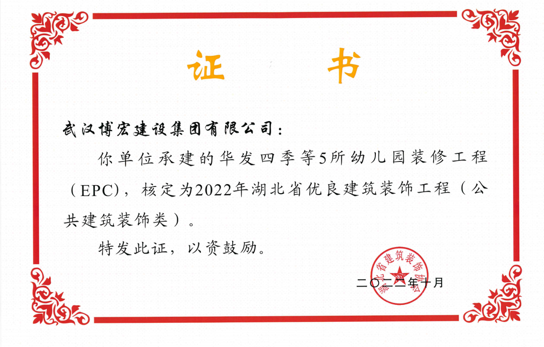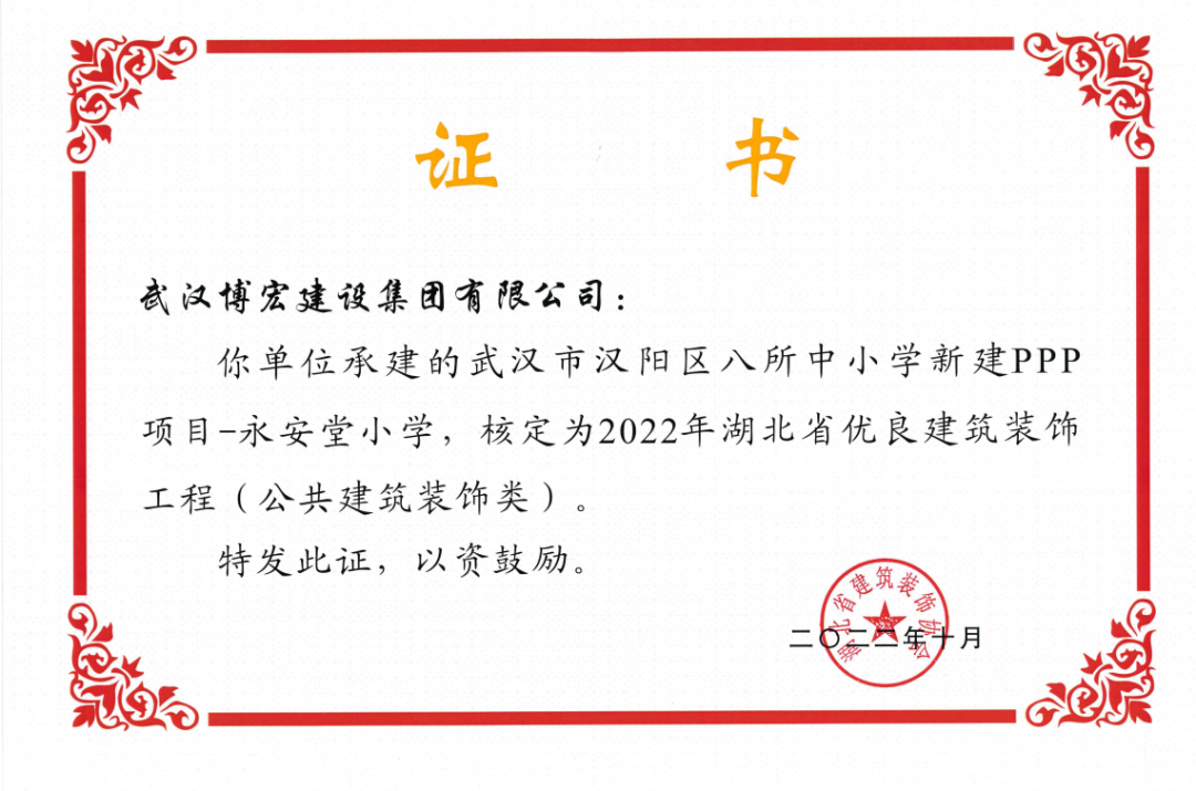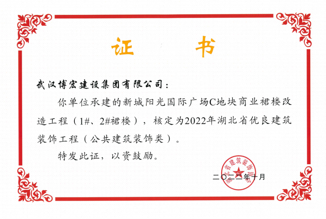 近日,湖北省建筑裝飾協會發(fā)布了《關于開展2022年湖北省建筑裝飾工程質量目標考核工作的通知》,由博宏建設集團承建的華發(fā)四季等5所幼兒園裝修工程(EPC)、新城陽光國際廣場C地塊商業(yè)裙樓改造工程(1#、2#裙樓)、新城陽光國際廣場D地塊商業(yè)裙樓改造工程(D座裙樓)、武漢市漢陽區(qū)八所中小學新建PPP項目-永安堂小學被核定為“2022年湖北省優(yōu)良建筑裝飾工程(公共建筑裝飾類)”。