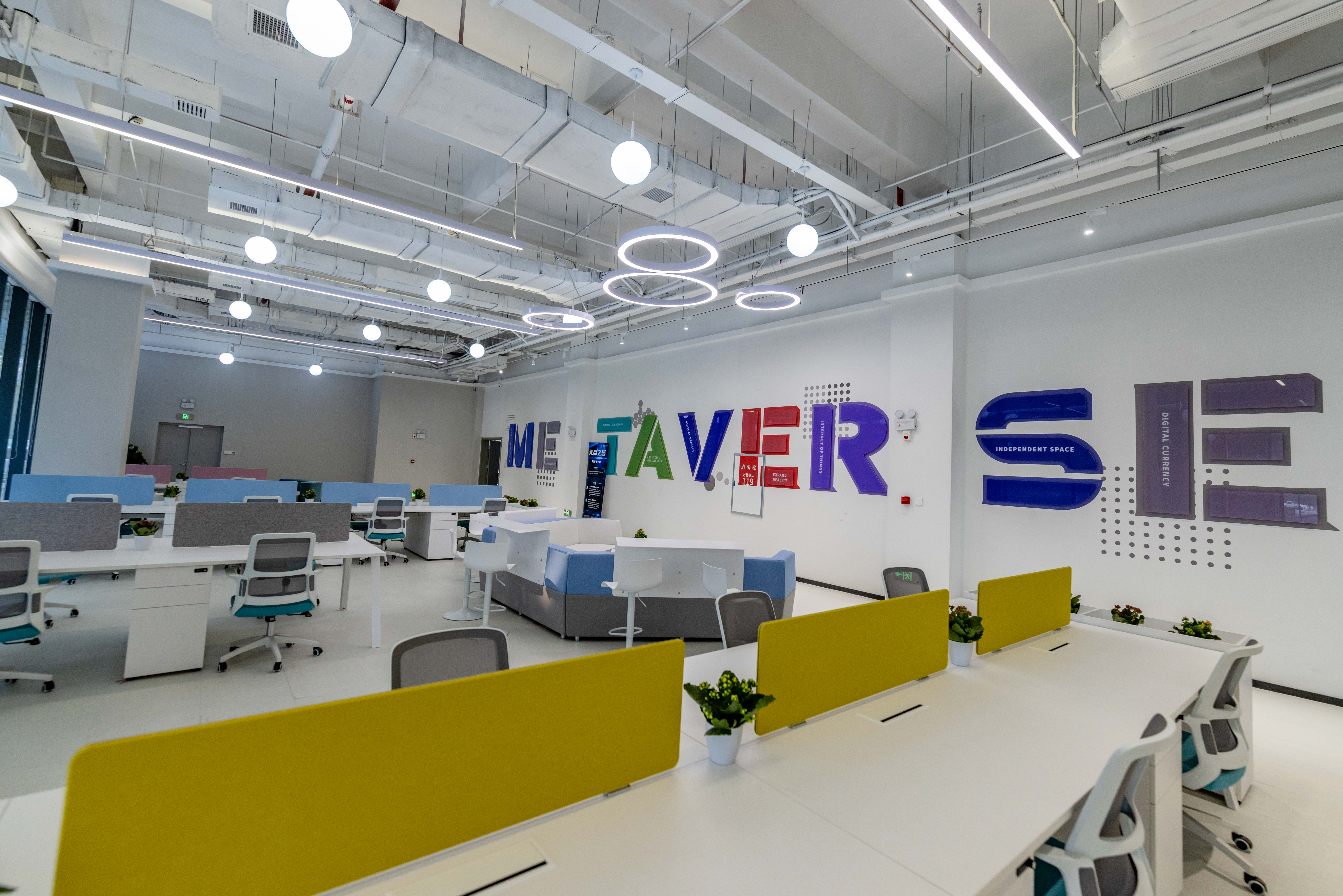 利用不同顏色不同紋理的木紋磚將辦公區域與休閑區域進行分割。這樣各功能性分區都有固定的主要功能,也可安置各自的特色家具。整個空間采用了親和、天然性的裝飾材料,顏色的碰撞、元宇宙元素的融合,創造了具有未來感、幸福感的空間氛圍。