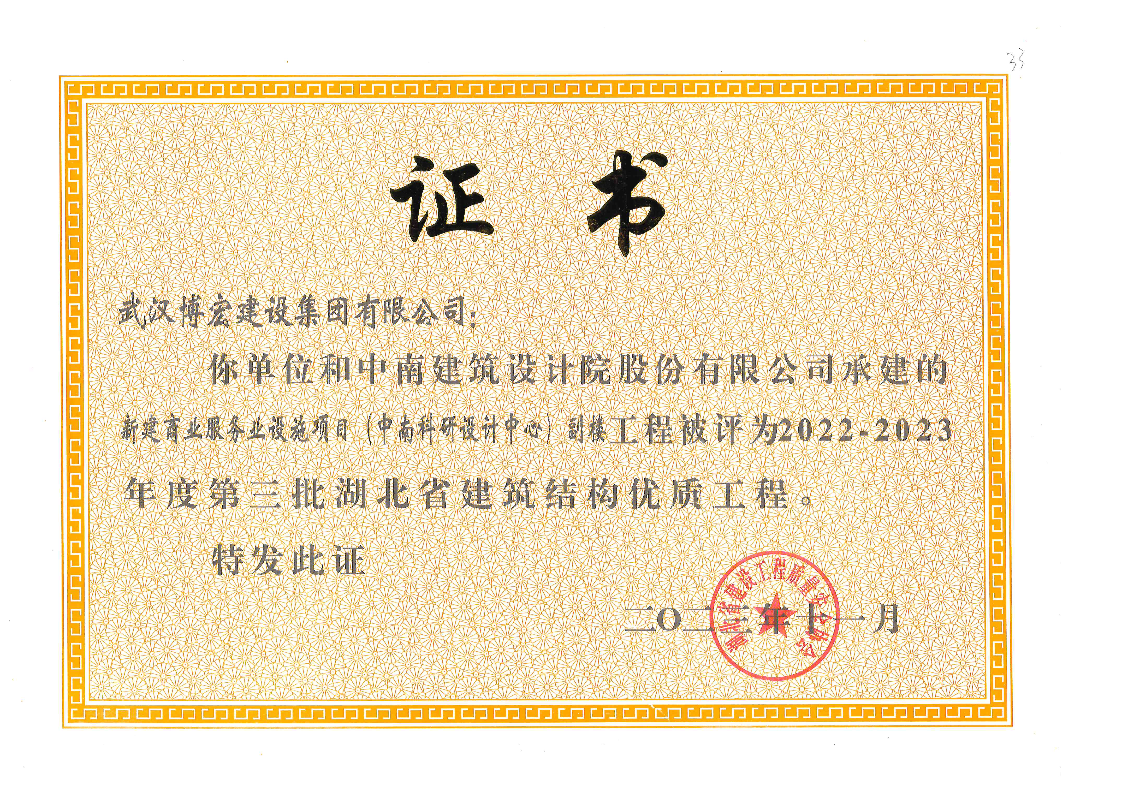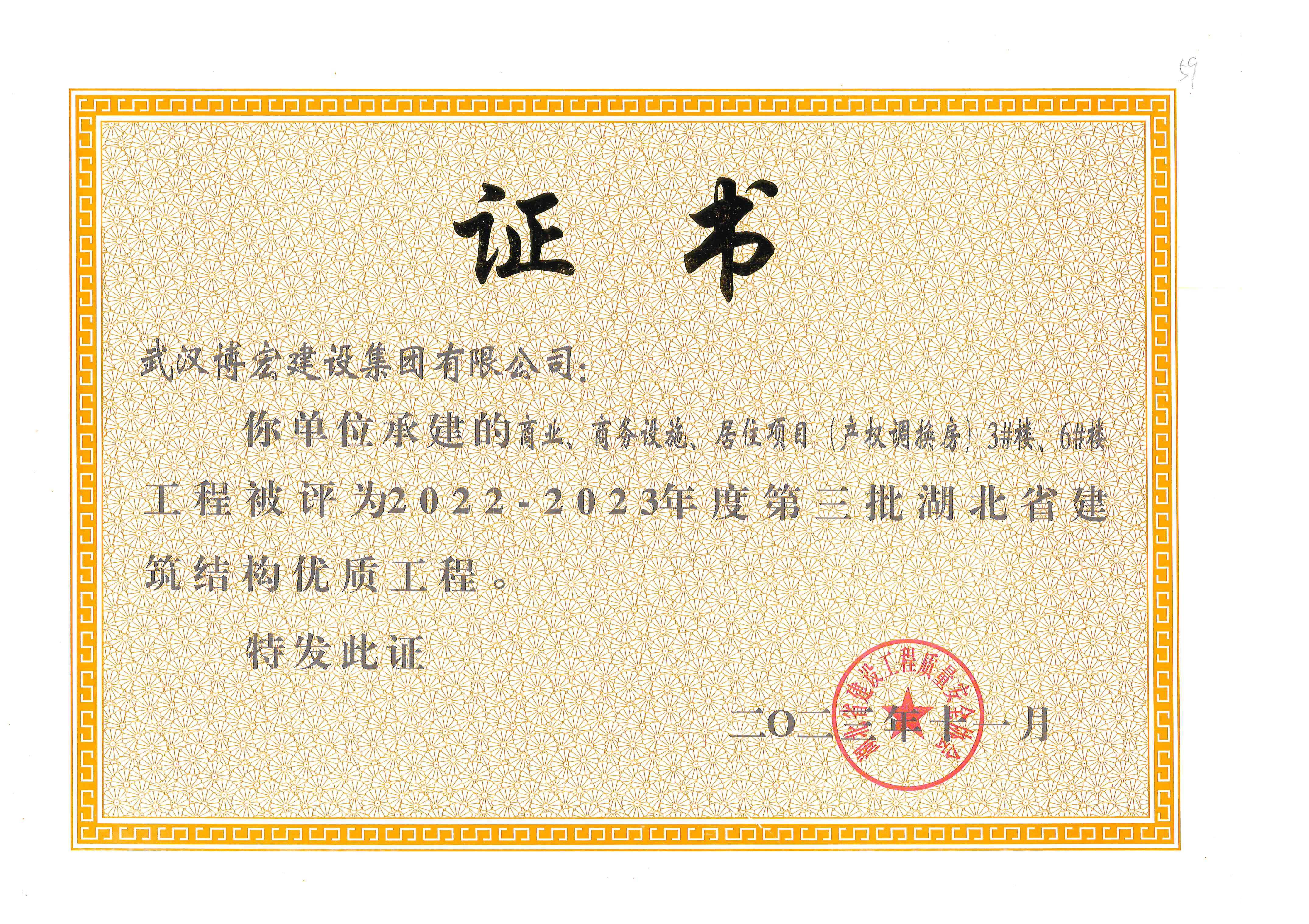 近日,湖北省建設工程質量安全協會公布2022-2023年度第三批湖北省建筑結構優質工程項目名單,由博宏建設集團承建的居住項目(黃金口村還建房B地塊)17#樓,居住項目(四臺村還建房B地塊)1#樓,新建商業服務業設施項目(中南科研設計中心)副樓,商業、商務設施、居住項目(產權調換房)3#樓、6#樓,國投·汀蘭7#樓、8#樓、9#樓、12#樓,隨州市中心看守所辦公區、監區及配電房榮獲湖北省建筑結構優質工程獎。