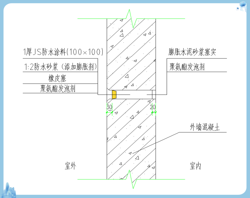 孔洞需清理并濕潤,橡皮塞需塞緊,膨脹水泥砂漿需堵塞密實,發泡膠密實度需保證,JS 防水厚度及范圍需保證。